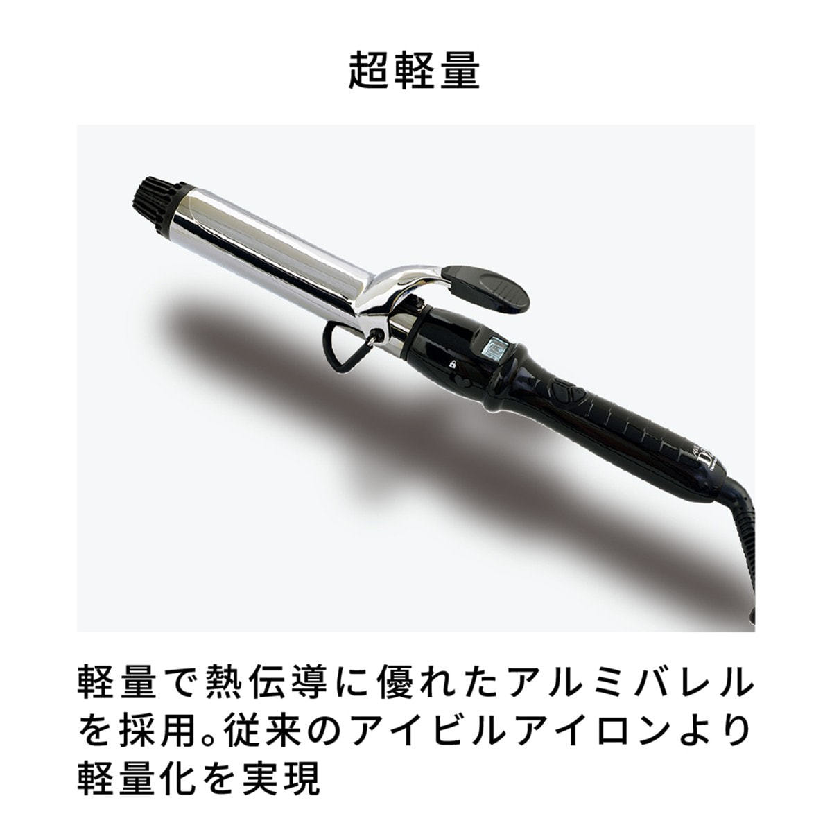 軽くて熱伝導に優れたアルミにチタン/ゴールドにコーティングされた長い髪でも逃げないロングバレル(105㎜)を採用することで、鉄製のバレルに比べ、約30%の軽量化を図りました。