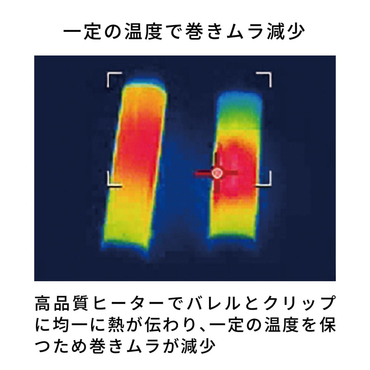 高品質ヒーターを使用していますので、バレルの先端・中央・根元で温度に差が出ず、バレルとクリップに均等に熱が伝わるので、仕上がりにムラが出ません。